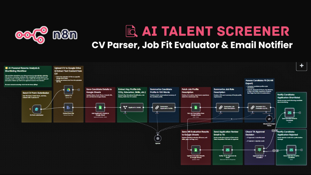 This ready-to-use n8n workflow template helps HR teams, recruiters, and startups automate the entire CV analysis & shortlisting process using AI. From CV submission to resume parsing, AI-powered semantic fit scoring, and automated email notifications β everything is fully built in.